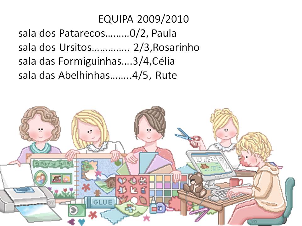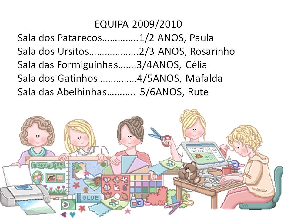 Somos cinco educadoras e no blog da nossa escola,uma das estratégias que criámos para fomentar a relação escola/família e dar visibilidade ao nosso trabalho e à nossa profissão de educadoras, encontram uma série de actividades que realizamos no dia a dia da nossa instituição, com os nossos "fofos" e o apoio das nossas empenhadas auxiliares de acção educativa.